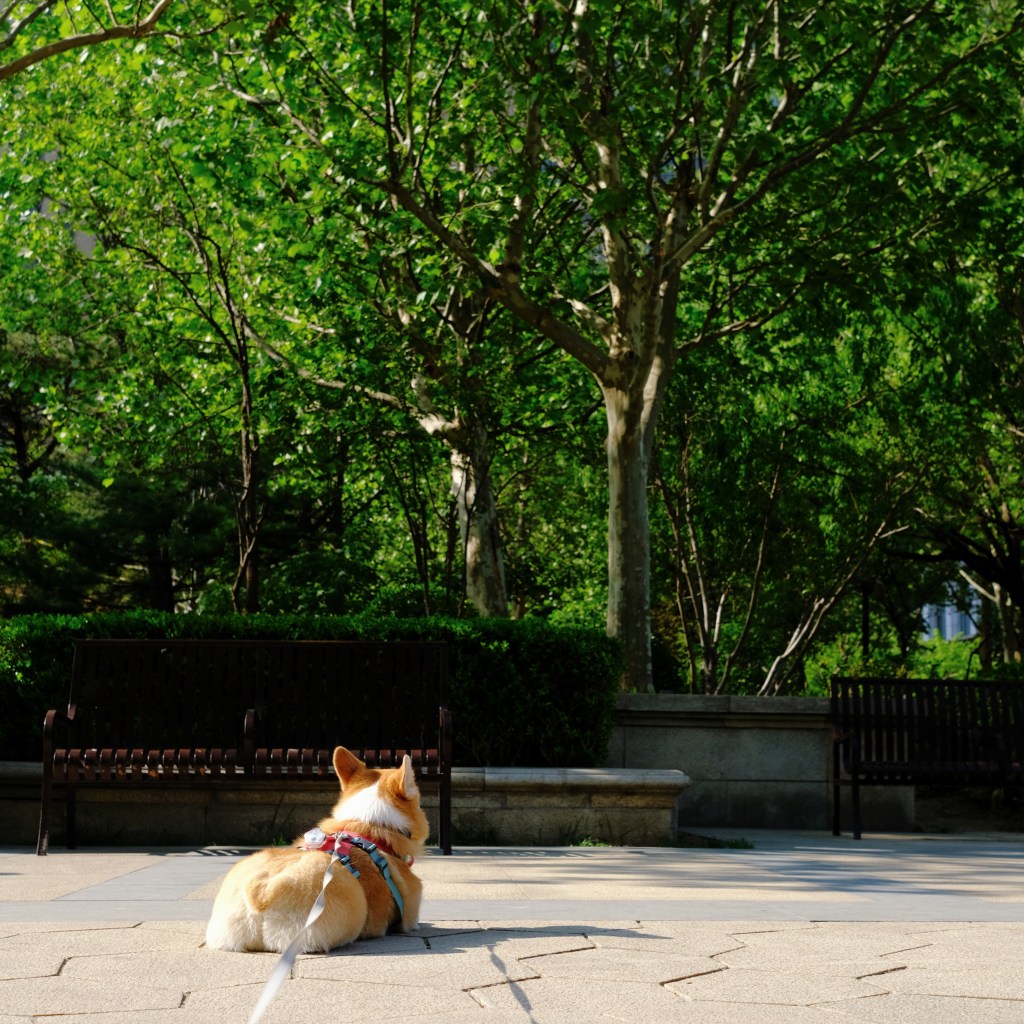 假期的午后,阳光很暖,我带着喜丢比在小区里遛弯,看它闲适地沉浸在阳光里不想回家,便把它抱起来放在大树下的长椅上。它全然放松地趴着,我坐在它旁边,给它按摩,也跟它时不时唠几句嗑,或一起拍自拍合影。